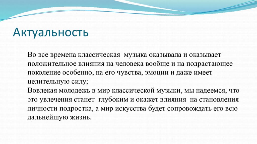 Во все времена классическая музыка оказывала и оказывает положительное влияния на человека вообще и на подрастающее поколение особенно, на его чувства, эмоции и даже имеет целительную силу; Вовлекая молодежь в мир классической музыки, мы надеемся, что это увлечения станет глубоким и окажет влияния на становления личности подростка, а мир искусства будет сопровождать его всю дальнейшую жизнь.