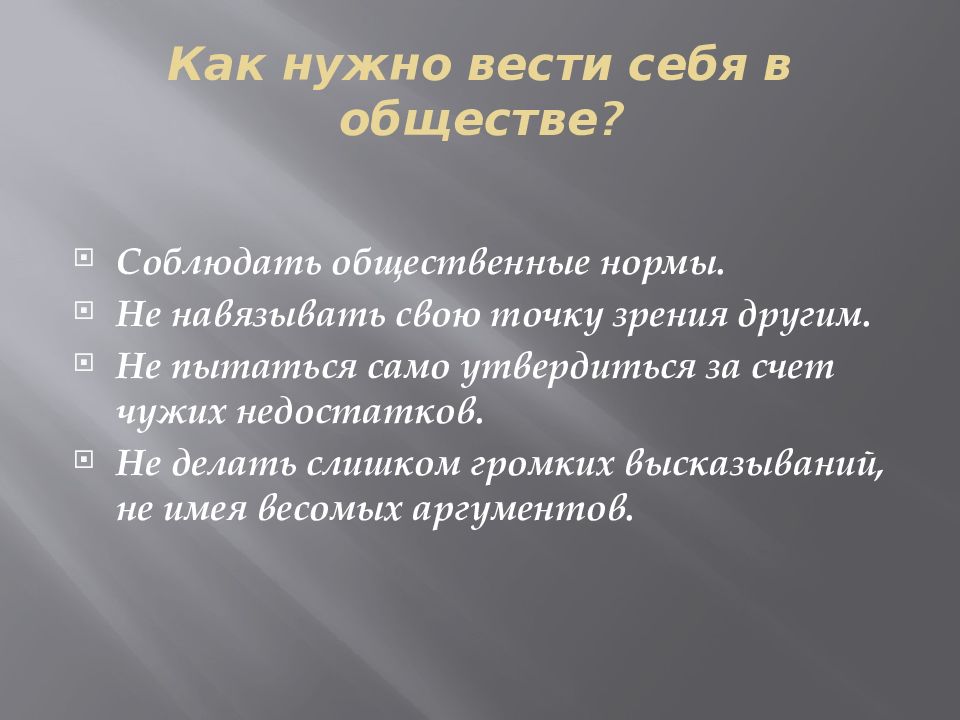 Соблюдать общественные нормы. Не навязывать свою точку зрения другим. Не пытаться само утвердиться за счет чужих недостатков. Не делать слишком громких высказываний, не имея весомых аргументов.