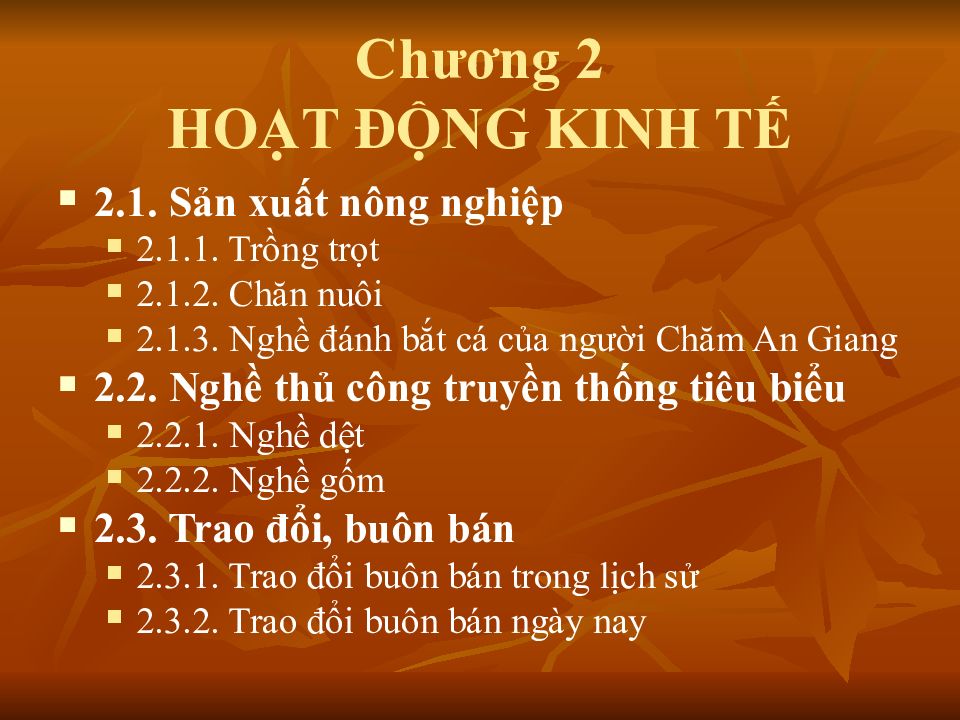 2.1. Sản xuất nông nghiệp 2.1.1. Trồng trọt 2.1.2. Chăn nuôi 2.1.3. Nghề đánh bắt cá của người Chăm An Giang 2.2. Nghề thủ công truyền thống tiêu biểu 2.2.1. Nghề dệt 2.2.2. Nghề gốm 2.3. Trao đổi, buôn bán 2.3.1. Trao đổi buôn bán trong lịch sử 2.3.2. Trao đổi buôn bán ngày nay