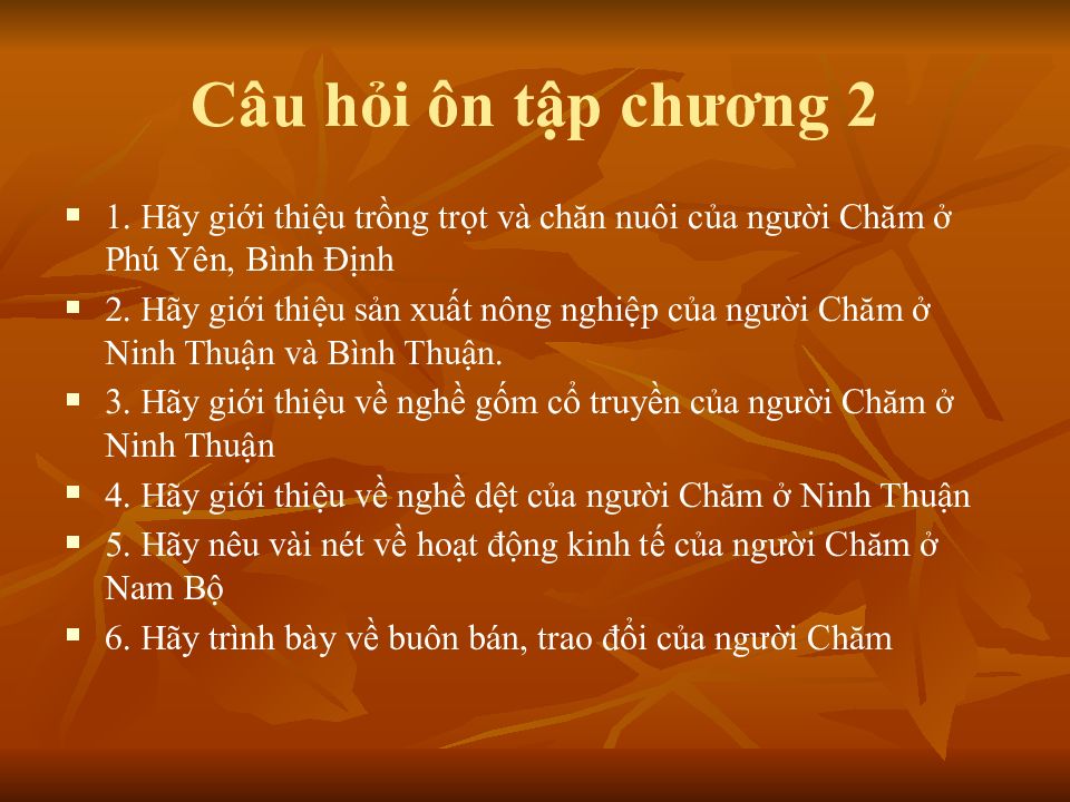 Последний слайд презентации: VĂN HÓA CHĂM Chương 2 HOẠT ĐỘNG KINH TẾ: Câu hỏi ôn tập chương 2