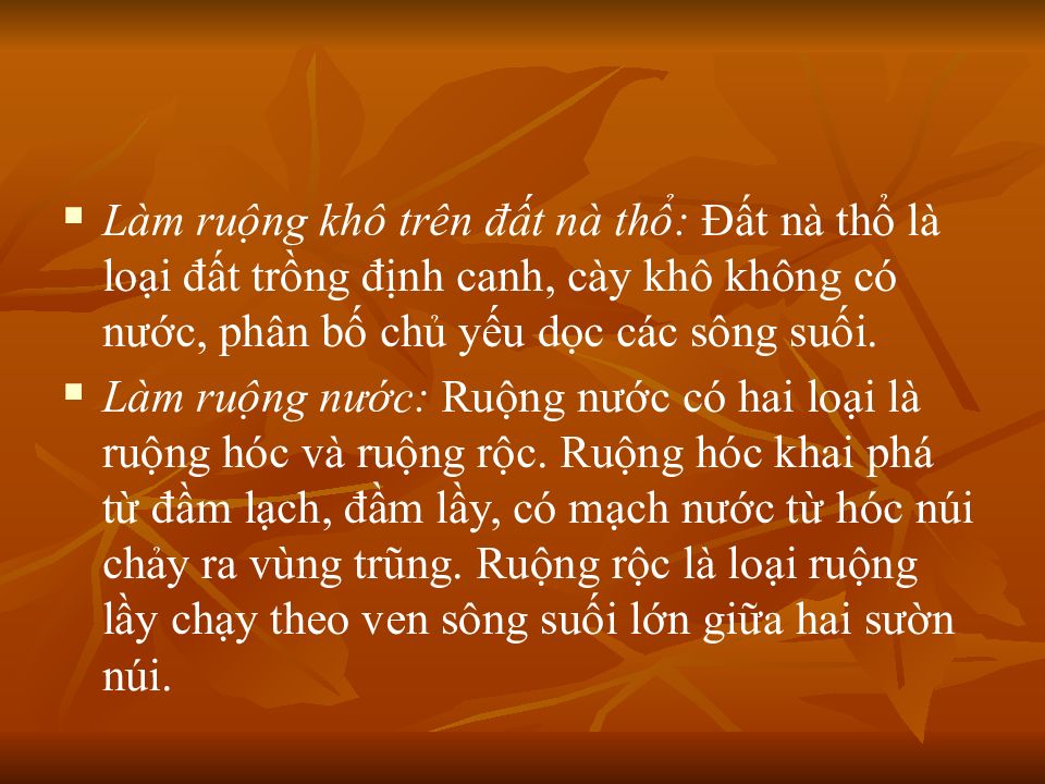 Làm ruộng khô trên đất nà thổ: Đất nà thổ là loại đất trồng định canh, cày khô không có nước, phân bố chủ yếu dọc các sông suối. Làm ruộng nước: Ruộng nước có hai loại là ruộng hóc và ruộng rộc. Ruộng hóc khai phá từ đầm lạch, đầm lầy, có mạch nước từ hóc núi chảy ra vùng trũng. Ruộng rộc là loại ruộng lầy chạy theo ven sông suối lớn giữa hai sườn núi.