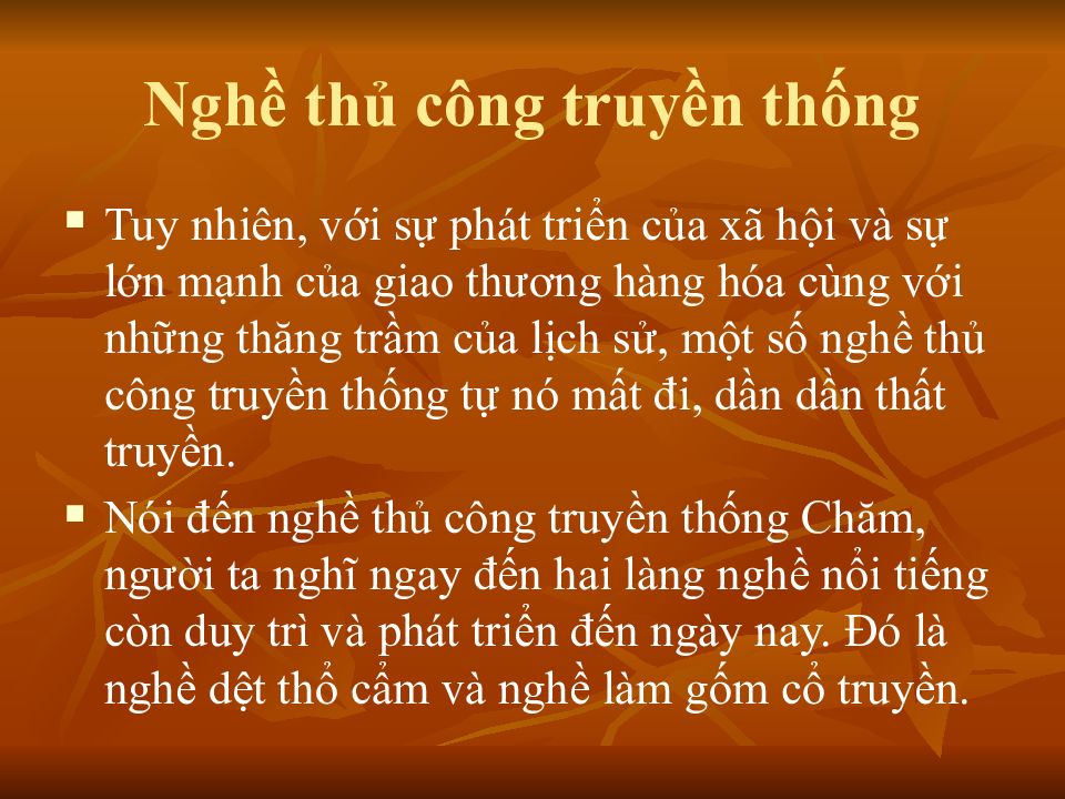 Tuy nhiên, với sự phát triển của xã hội và sự lớn mạnh của giao thương hàng hóa cùng với những thăng trầm của lịch sử, một số nghề thủ công truyền thống tự nó mất đi, dần dần thất truyền. N ói đến nghề thủ công truyền thống Chăm, người ta nghĩ ngay đến hai làng nghề nổi tiếng còn duy trì và phát triển đến ngày nay. Đó là nghề dệt thổ cẩm và nghề làm gốm cổ truyền.