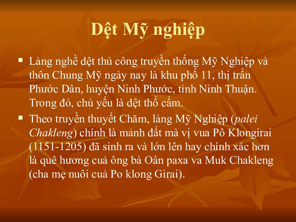 Làng nghề dệt thủ công truyền thống Mỹ Nghiệp và thôn Chung Mỹ ngày nay là khu phố 11, thị trấn Phước Dân, huyện Ninh Phước, tỉnh Ninh Thuận. Trong đó, chủ yếu là dệt thổ cẩm. Theo truyền thuyết Chăm, làng Mỹ Nghiệp ( p alei Chakleng ) chính là mảnh đất mà vị vua Pô Klongirai (1151-1205) đã sinh ra và lớn lên hay chính xác hơn là quê hương cuả ông bà Oân paxa va Muk Chakleng ( cha mẹ nuôi cuả Po klong Girai).