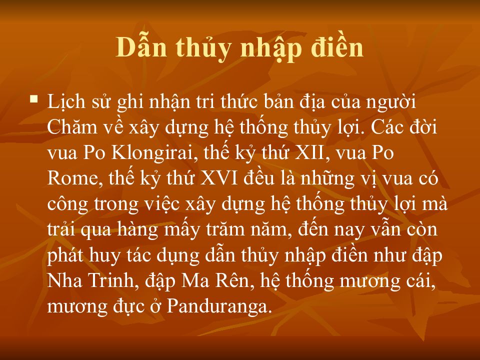 Lịch sử ghi nhận tri thức bản địa của người Chăm về xây dựng hệ thống thủy lợi. Các đời vua Po Klongirai, thế kỷ thứ XII, vua Po Rome, thế kỷ thứ XVI đều là những vị vua có công trong việc xây dựng hệ thống thủy lợi mà trải qua hàng mấy trăm năm, đến nay vẫn còn phát huy tác dụng dẫn thủy nhập điền như đập Nha Trinh, đập Ma Rên, hệ thống mương cái, mương đực ở Panduranga.