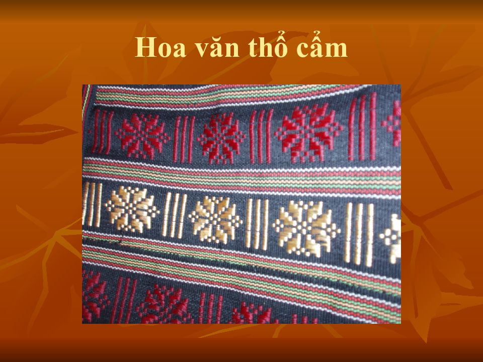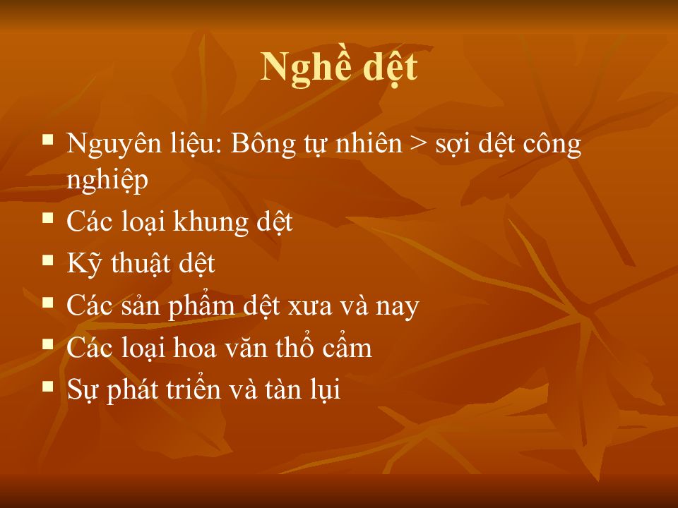 Nguyên liệu: Bông tự nhiên > sợi dệt công nghiệp Các loại khung dệt Kỹ thuật dệt Các sản phẩm dệt xưa và nay Các loại hoa văn thổ cẩm Sự phát triển và tàn lụi