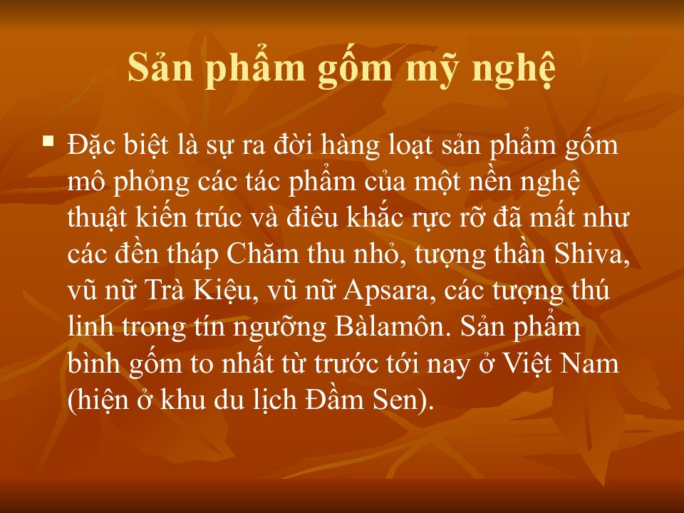 Đặc biệt là sự ra đời hàng loạt sản phẩm gốm mô phỏng các tác phẩm của một nền nghệ thuật kiến trúc và điêu khắc rực rỡ đã mất như các đền tháp Chăm thu nhỏ, tượng thần Shiva, vũ nữ Trà Kiệu, vũ nữ Apsara, các tượng thú linh trong tín ngưỡng Bàlamôn. Sản phẩm bình gốm to nhất từ trước tới nay ở Việt Nam (hiện ở khu du lịch Đầm Sen).