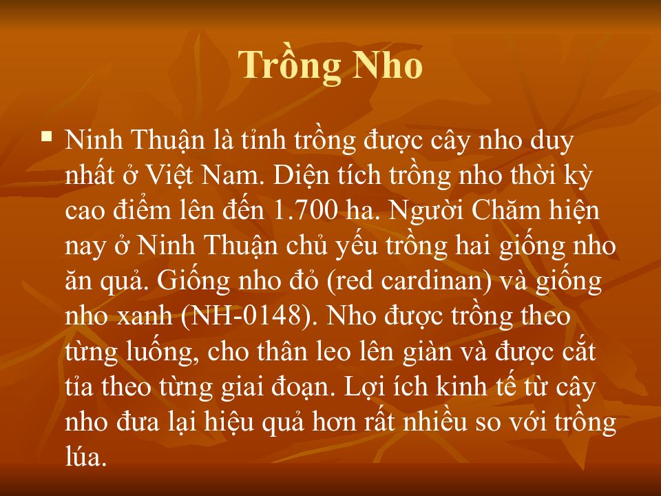 Ninh Thuận là tỉnh trồng được cây nho duy nhất ở Việt Nam. Diện tích trồng nho thời kỳ cao điểm lên đến 1.700 ha. Người Chăm hiện nay ở Ninh Thuận chủ yếu trồng hai giống nho ăn quả. Giống nho đỏ (red cardinan) và giống nho xanh (NH-0148). Nho được trồng theo từng luống, cho thân leo lên giàn và được cắt tỉa theo từng giai đoạn. Lợi ích kinh tế từ cây nho đưa lại hiệu quả hơn rất nhiều so với trồng lúa.