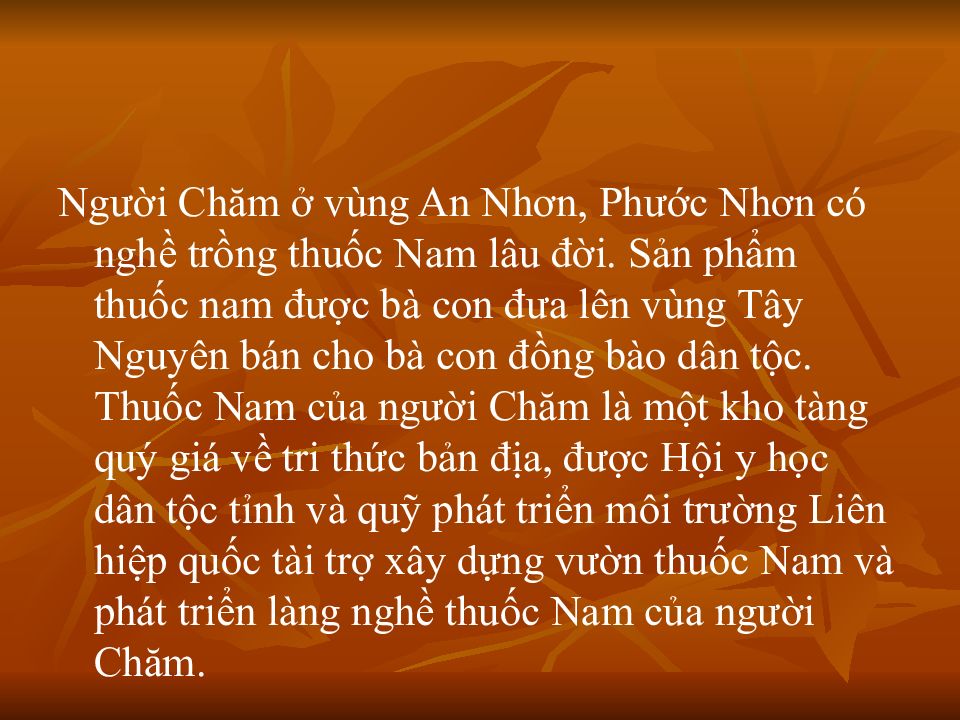 Người Chăm ở vùng An Nhơn, Phước Nhơn có nghề trồng thuốc Nam lâu đời. Sản phẩm thuốc nam được bà con đưa lên vùng Tây Nguyên bán cho bà con đồng bào dân tộc. Thuốc Nam của người Chăm là một kho tàng quý giá về tri thức bản địa, được Hội y học dân tộc tỉnh và quỹ phát triển môi trường Liên hiệp quốc tài trợ xây dựng vườn thuốc Nam và phát triển làng nghề thuốc Nam của người Chăm.