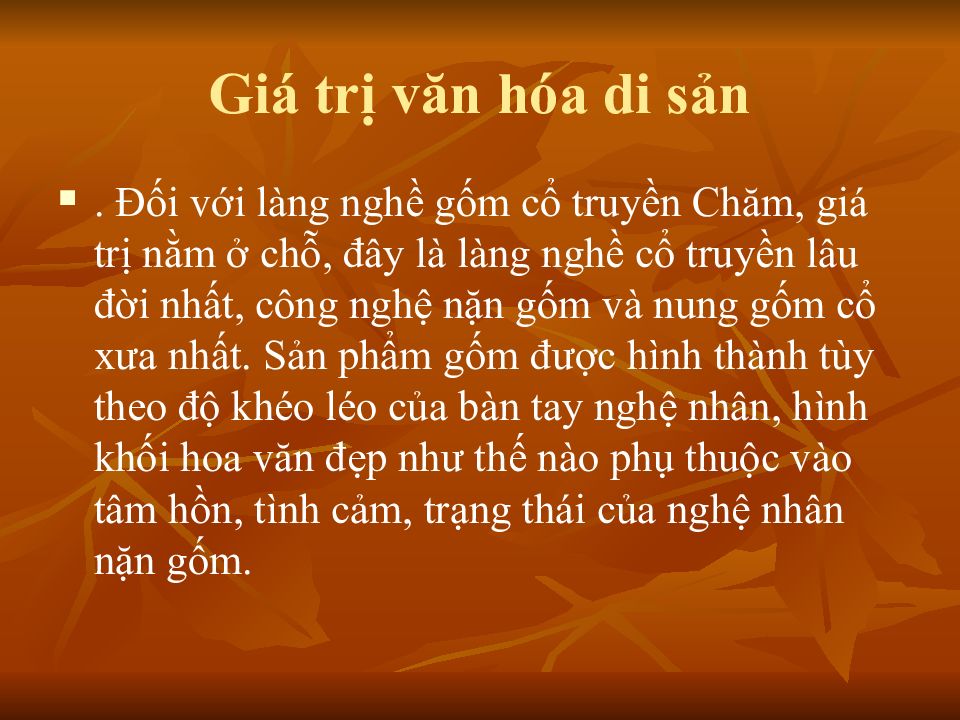 . Đối với làng nghề gốm cổ truyền Chăm, giá trị nằm ở chỗ, đây là làng nghề cổ truyền lâu đời nhất, công nghệ nặn gốm và nung gốm cổ xưa nhất. Sản phẩm gốm được hình thành tùy theo độ khéo léo của bàn tay nghệ nhân, hình khối hoa văn đẹp như thế nào phụ thuộc vào tâm hồn, tình cảm, trạng thái của nghệ nhân nặn gốm.