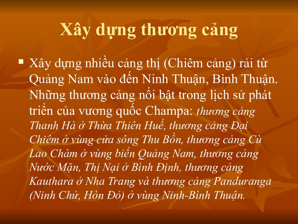 Xây dựng nhiều cảng thị (Chiêm cảng) rải từ Quảng Nam vào đến Ninh Thuận, Bình Thuận. Những thương cảng nổi bật trong lịch sử phát triển của vương quốc Champa: thương cảng Thanh Hà ở Thừa Thiên Huế, thương cảng Đại Chiêm ở vùng cửa sông Thu Bồn, thương cảng Cù Lao Chàm ở vùng biển Quảng Nam, thương cảng Nước Mặn, Th ị Nại ở B ình Định, thương cảng Kauthara ở Nha Trang và th ương cảng Panduranga (Ninh Chử, Hòn Đỏ) ở vùng Ninh-B ình Thuận.
