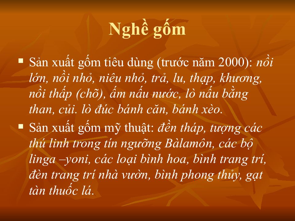 Sản xuất gốm tiêu dùng (trước năm 2000): nồi lớn, nồi nhỏ, niêu nhỏ, trả, lu, thạp, khương, nồi thấp (chõ), ấm nấu nước, lò nấu bằng than, củi. lò đúc bánh căn, bánh xèo. Sản xuất gốm mỹ thuật: đền tháp, tượng các thú linh trong tín ngưỡng Bàlamôn, các bộ linga –yoni, các loại bình hoa, bình trang trí, đèn trang trí nhà vườn, bình phong thủy, gạt tàn thuốc lá.