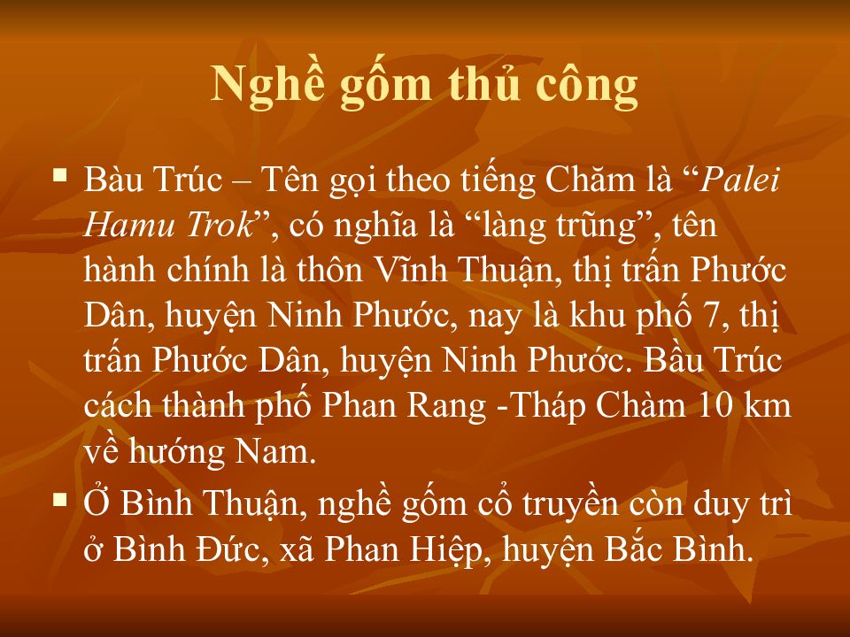 Bàu Trúc – Tên gọi theo tiếng Chăm là “ Palei Hamu Trok ”, có nghĩa là “làng trũng”, tên hành chính là thôn Vĩnh Thuận, thị trấn Phước Dân, huyện Ninh Phước, nay là khu phố 7, thị trấn Phước Dân, huyện Ninh Phước. Bầu Trúc cách thành phố Phan Rang -Tháp Chàm 10 km về hướng Nam. Ở Bình Thuận, nghề gốm cổ truyền còn duy trì ở Bình Đức, xã Phan Hiệp, huyện Bắc Bình.