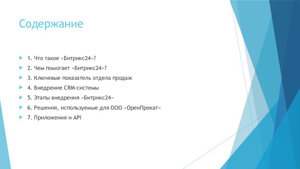 1. Что такое « Битрикс24 »? 2. Чем помогает «Битрикс24»? 3. Ключевые показатель отдела продаж 4. Внедрение CRM -системы 5. Этапы внедрения «Битрикс24» 6. Решения, используемые для ООО « ОренПрокат » 7. Приложения и API