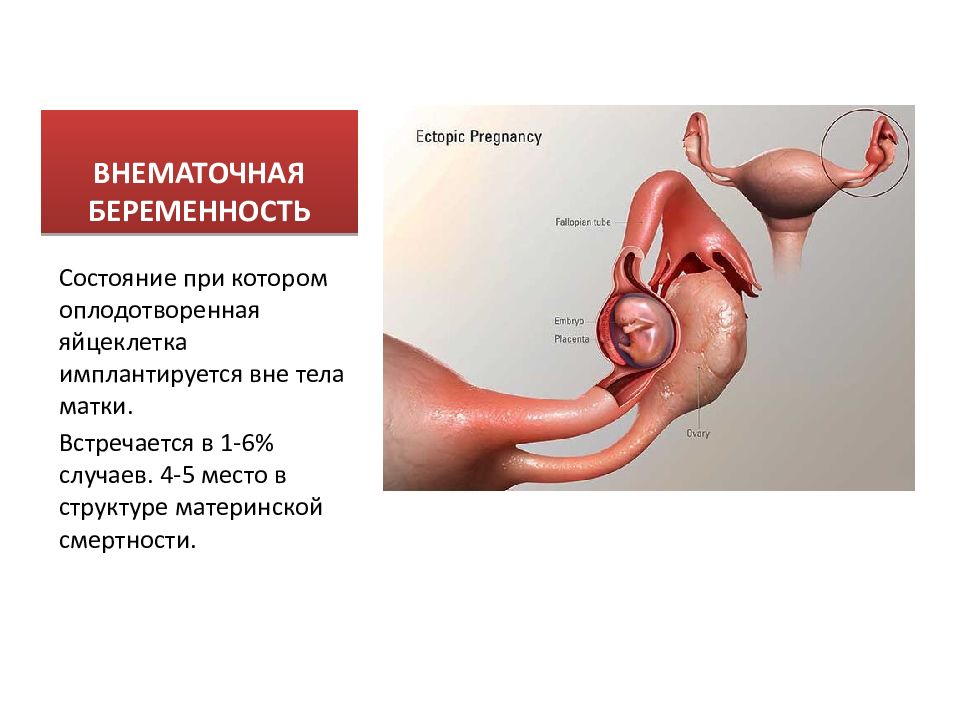 Состояние при котором оплодотворенная яйцеклетка имплантируется вне тела матки. Встречается в 1-6% случаев. 4-5 место в структуре материнской смертности.