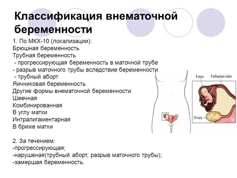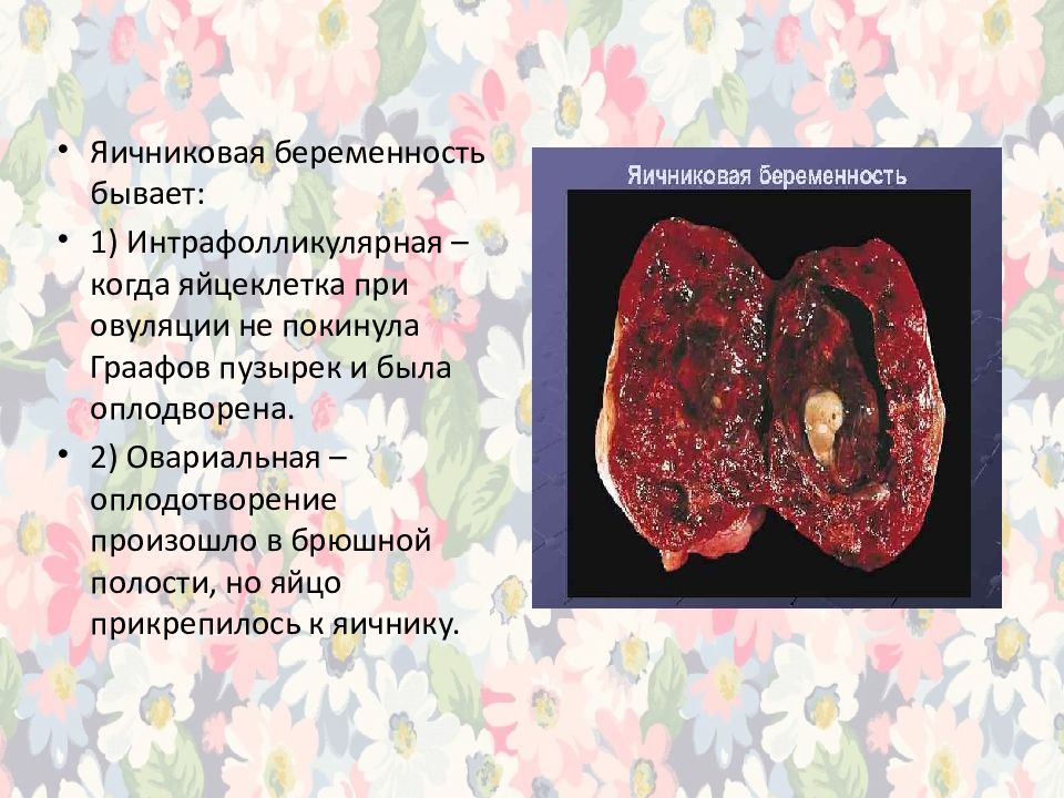 Яичниковая беременность бывает: 1) Интрафолликулярная – когда яйцеклетка при овуляции не покинула Граафов пузырек и была оплодворена. 2) Овариальная – оплодотворение произошло в брюшной полости, но яйцо прикрепилось к яичнику.