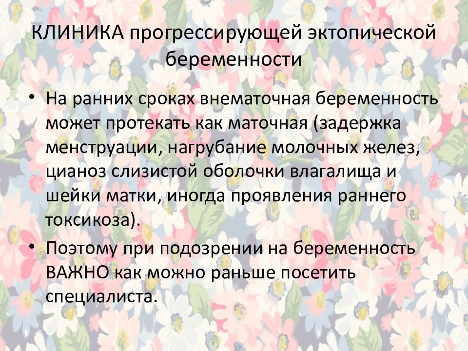 Слайд 11: КЛИНИКА прогрессирующей эктопической беременности