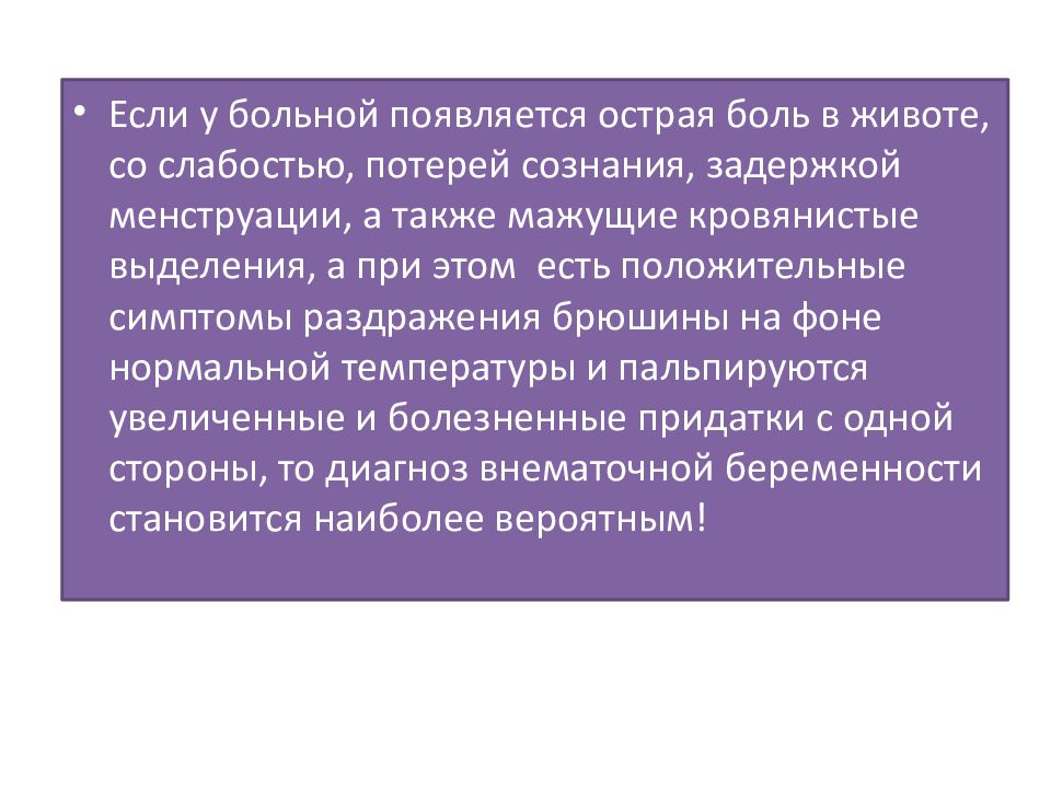 Если у больной появляется острая боль в животе, со слабостью, потерей сознания, задержкой менструации, а также мажущие кровянистые выделения, а при этом есть положительные симптомы раздражения брюшины на фоне нормальной температуры и пальпируются увеличенные и болезненные придатки с одной стороны, то диагноз внематочной беременности становится наиболее вероятным!
