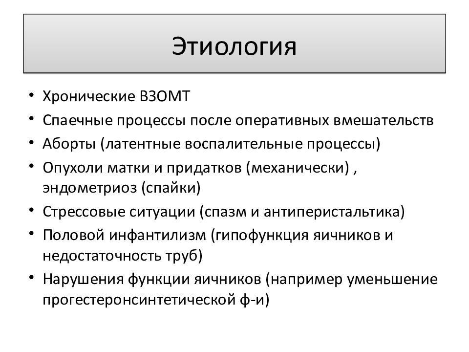 Хронические ВЗОМТ Спаечные процессы после оперативных вмешательств Аборты (латентные воспалительные процессы) Опухоли матки и придатков (механически), эндометриоз (спайки) Стрессовые ситуации (спазм и антиперистальтика) Половой инфантилизм (гипофункция яичников и недостаточность труб) Нарушения функции яичников (например уменьшение прогестеронсинтетической ф-и)