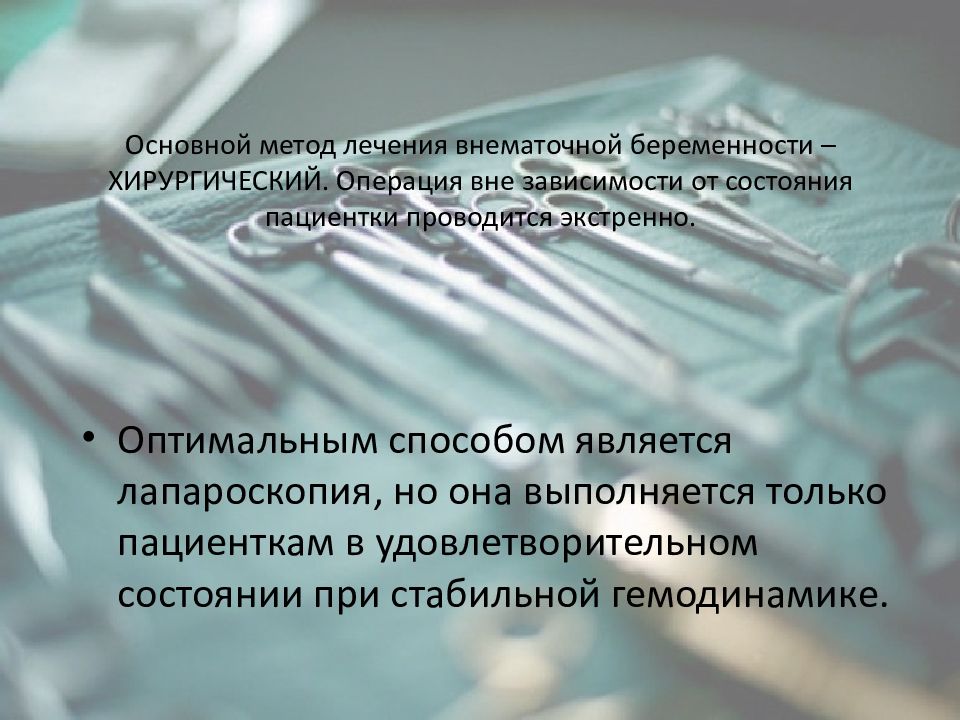 Слайд 17: Основной метод лечения внематочной беременности – ХИРУРГИЧЕСКИЙ. Операция вне зависимости от состояния пациентки проводится экстренно