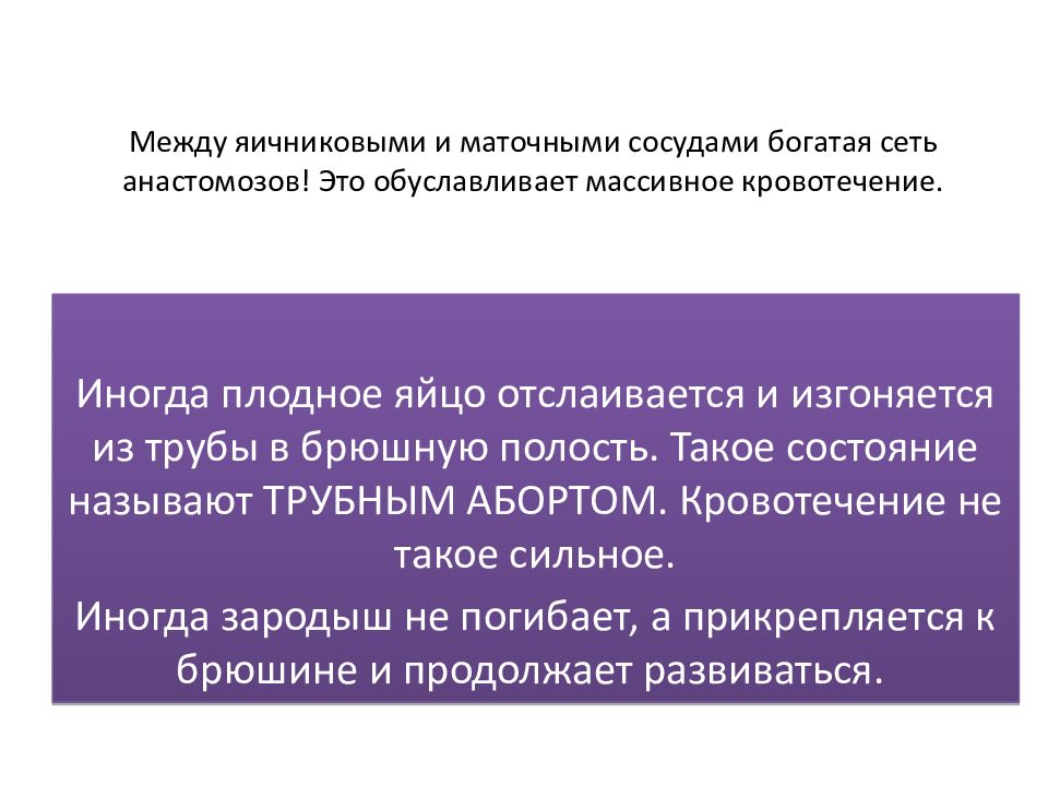 Иногда плодное яйцо отслаивается и изгоняется из трубы в брюшную полость. Такое состояние называют ТРУБНЫМ АБОРТОМ. Кровотечение не такое сильное. Иногда зародыш не погибает, а прикрепляется к брюшине и продолжает развиваться.