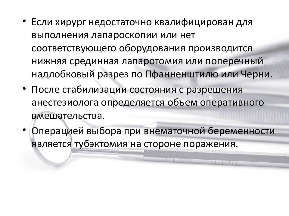 Если хирург недостаточно квалифицирован для выполнения лапароскопии или нет соответствующего оборудования производится нижняя срединная лапаротомия или поперечный надлобковый разрез по Пфанненштилю или Черни. После стабилизации состояния с разрешения анестезиолога определяется объем оперативного вмешательства. Операцией выбора при внематочной беременности является тубэктомия на стороне поражения.