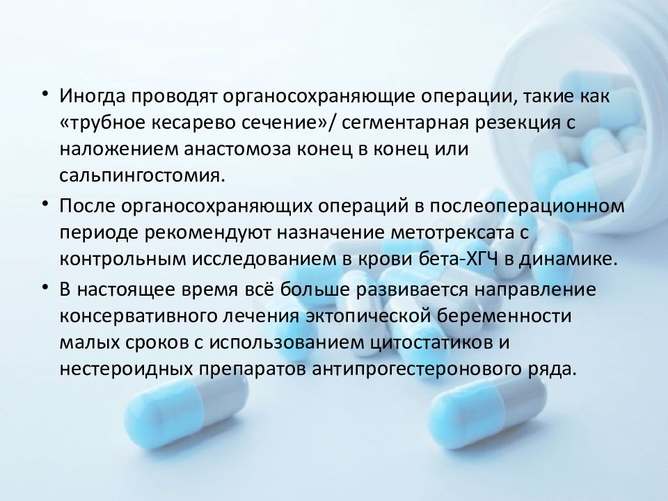 Иногда проводят органосохраняющие операции, такие как «трубное кесарево сечение»/ сегментарная резекция с наложением анастомоза конец в конец или сальпингостомия. После органосохраняющих операций в послеоперационном периоде рекомендуют назначение метотрексата с контрольным исследованием в крови бета-ХГЧ в динамике. В настоящее время всё больше развивается направление консервативного лечения эктопической беременности малых сроков с использованием цитостатиков и нестероидных препаратов антипрогестеронового ряда.