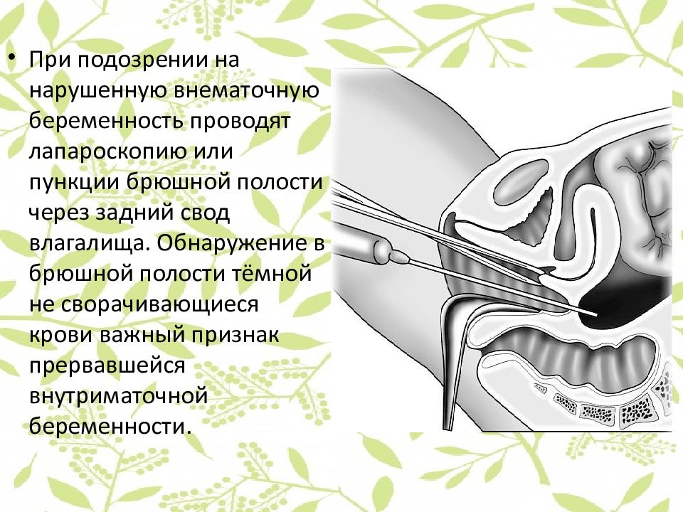 При подозрении на нарушенную внематочную беременность проводят лапароскопию или пункции брюшной полости через задний свод влагалища. Обнаружение в брюшной полости тёмной не сворачивающиеся крови важный признак прервавшейся внутриматочной беременности.