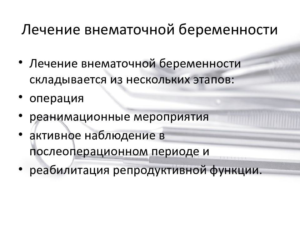 Лечение внематочной беременности складывается из нескольких этапов: операция реанимационные мероприятия активное наблюдение в послеоперационном периоде и реабилитация репродуктивной функции.