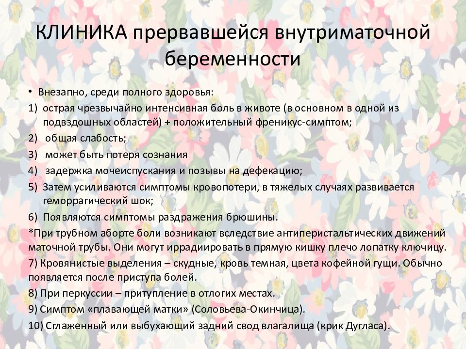 Внезапно, среди полного здоровья: острая чрезвычайно интенсивная боль в животе (в основном в одной из подвздошных областей) + положительный френикус-симптом; общая слабость; может быть потеря сознания задержка мочеиспускания и позывы на дефекацию; Затем усиливаются симптомы кровопотери, в тяжелых случаях развивается геморрагический шок; Появляются симптомы раздражения брюшины. *При трубном аборте боли возникают вследствие антиперистальтических движений маточной трубы. Они могут иррадиировать в прямую кишку плечо лопатку ключицу. 7) Кровянистые выделения – скудные, кровь темная, цвета кофейной гущи. Обычно появляется после приступа болей. 8) При перкуссии – притупление в отлогих местах. 9) Симптом «плавающей матки» (Соловьева- Окинчица ). 10) Сглаженный или выбухающий задний свод влагалища (крик Дугласа). КЛИНИКА прервавшейся внутриматочной беременности