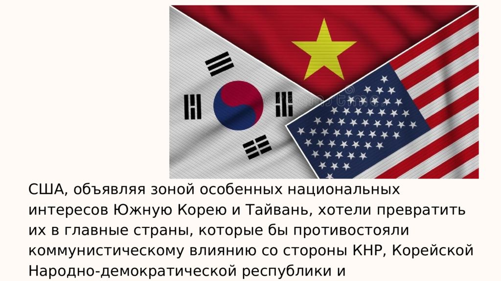 США, объявляя зоной особенных национальных интересов Южную Корею и Тайвань, хотели превратить их в главные страны, которые бы противостояли коммунистическому влиянию со стороны КНР, Корейской Народно-демократической республики и Социалистического Вьетнама.