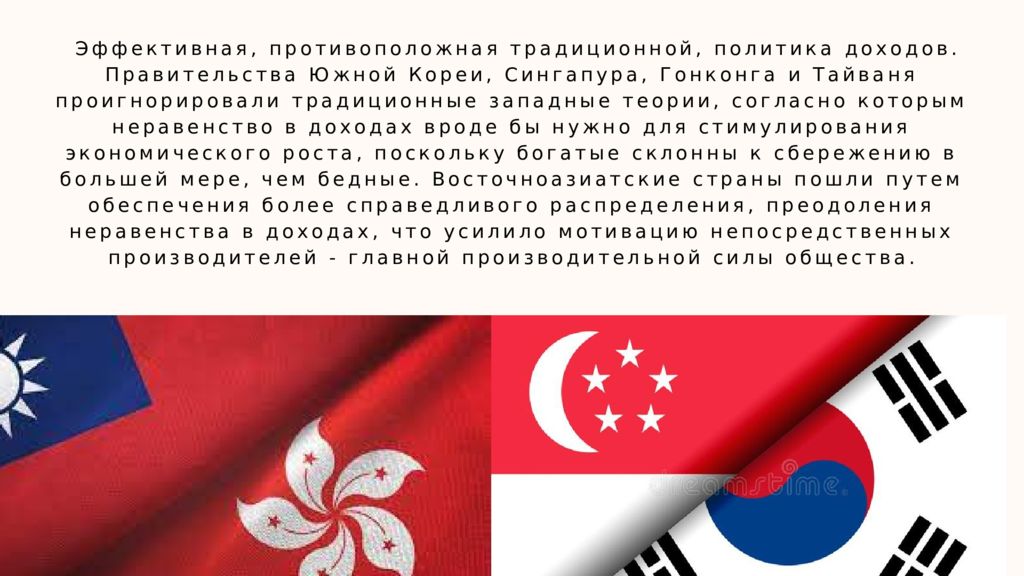 Эффективная, противоположная традиционной, политика доходов. Правительства Южной Кореи, Сингапура, Гонконга и Тайваня проигнорировали традиционные западные теории, согласно которым неравенство в доходах вроде бы нужно для стимулирования экономического роста, поскольку богатые склонны к сбережению в большей мере, чем бедные. Восточноазиатские страны пошли путем обеспечения более справедливого распределения, преодоления неравенства в доходах, что усилило мотивацию непосредственных производителей - главной производительной силы общества.