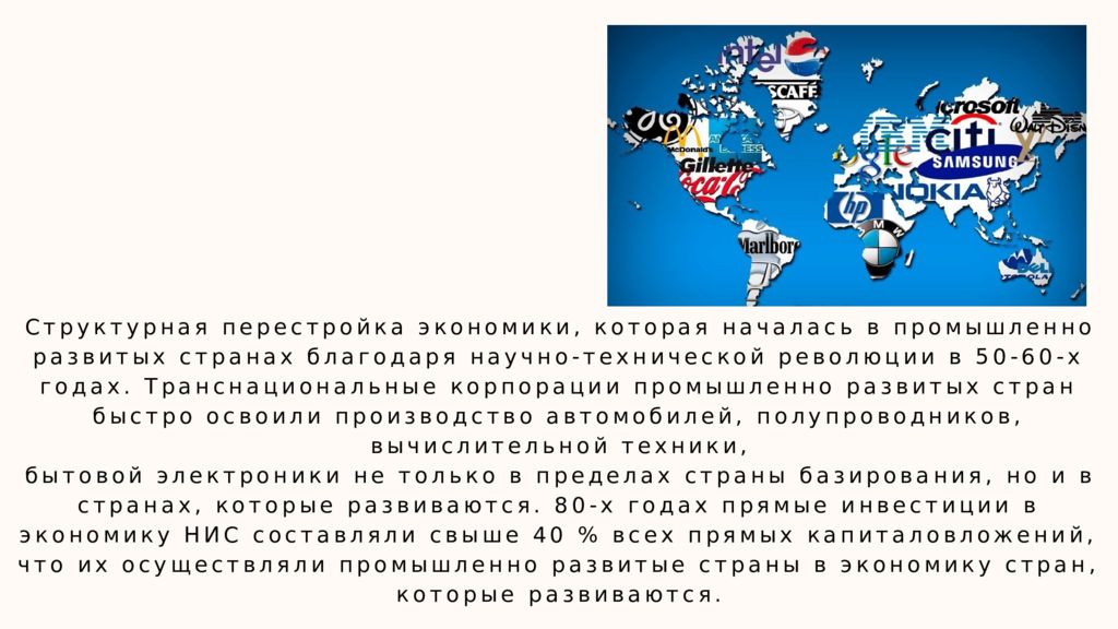 Структурная перестройка экономики, которая началась в промышленно развитых странах благодаря научно-технической революции в 50-60-х годах. Транснациональные корпорации промышленно развитых стран быстро освоили производство автомобилей, полупроводников, вычислительной техники, бытовой электроники не только в пределах страны базирования, но и в странах, которые развиваются. 80-х годах прямые инвестиции в экономику НИС составляли свыше 40 % всех прямых капиталовложений, что их осуществляли промышленно развитые страны в экономику стран, которые развиваются.
