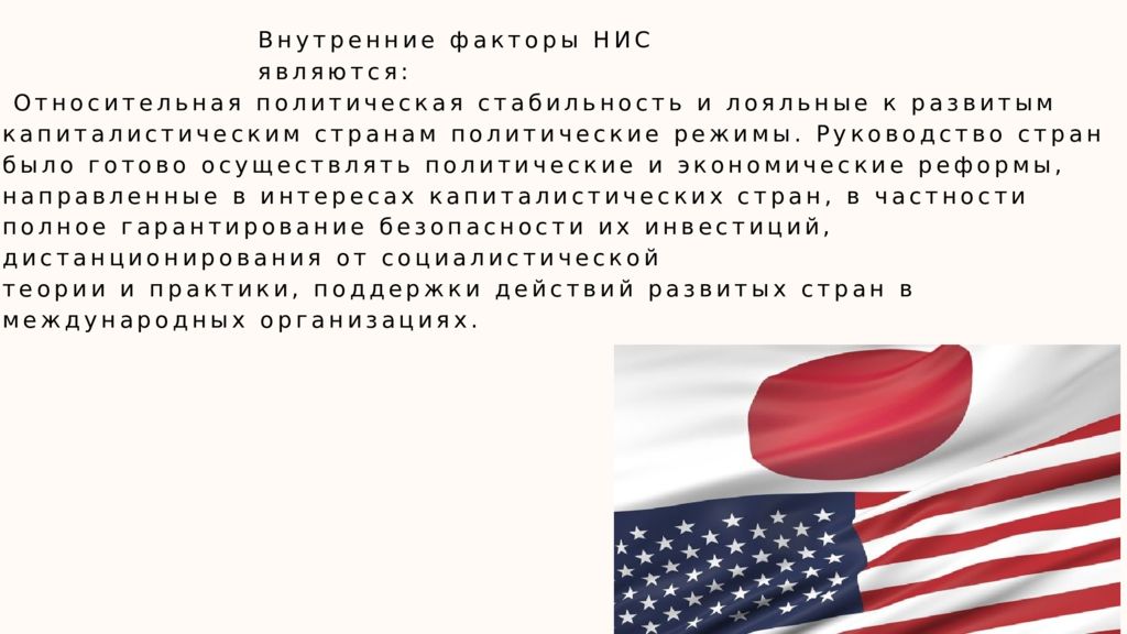 Относительная политическая стабильность и лояльные к развитым капиталистическим странам политические режимы. Руководство стран было готово осуществлять политические и экономические реформы, направленные в интересах капиталистических стран, в частности полное гарантирование безопасности их инвестиций, дистанционирования от социалистической теории и практики, поддержки действий развитых стран в международных организациях. Внутренние факторы НИС являются: