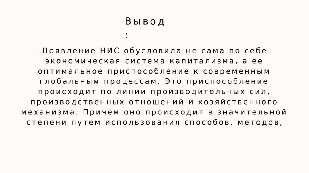 Появление НИС обусловила не сама по себе экономическая система капитализма, а ее оптимальное приспособление к современным глобальным процессам. Это приспособление происходит по линии производительных сил, производственных отношений и хозяйственного механизма. Причем оно происходит в значительной степени путем использования способов, методов, Вывод: