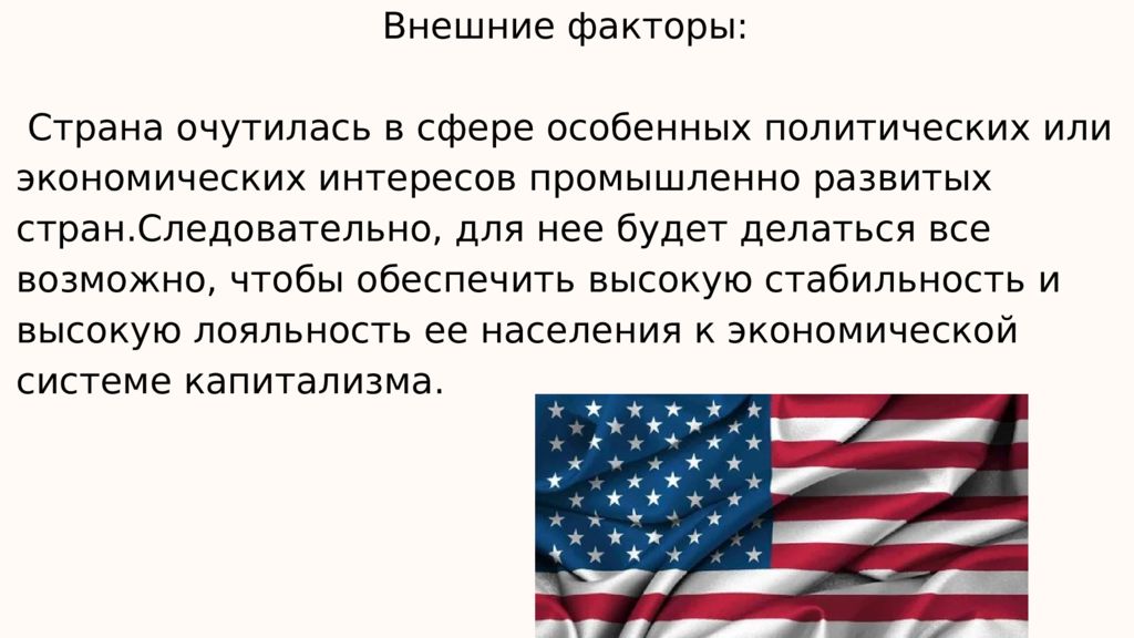 Внешние факторы: Страна очутилась в сфере особенных политических или экономических интересов промышленно развитых стран.Следовательно, для нее будет делаться все возможно, чтобы обеспечить высокую стабильность и высокую лояльность ее населения к экономической системе капитализма.