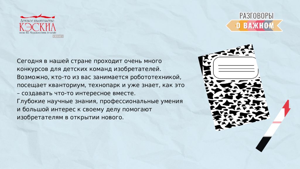 Сегодня в нашей стране проходит очень много конкурсов для детских команд изобретателей. Возможно, кто-то из вас занимается робототехникой, посещает кванториум, технопарк и уже знает, как это – создавать что-то интересное вместе. Глубокие научные знания, профессиональные умения и большой интерес к своему делу помогают изобретателям в открытии нового.