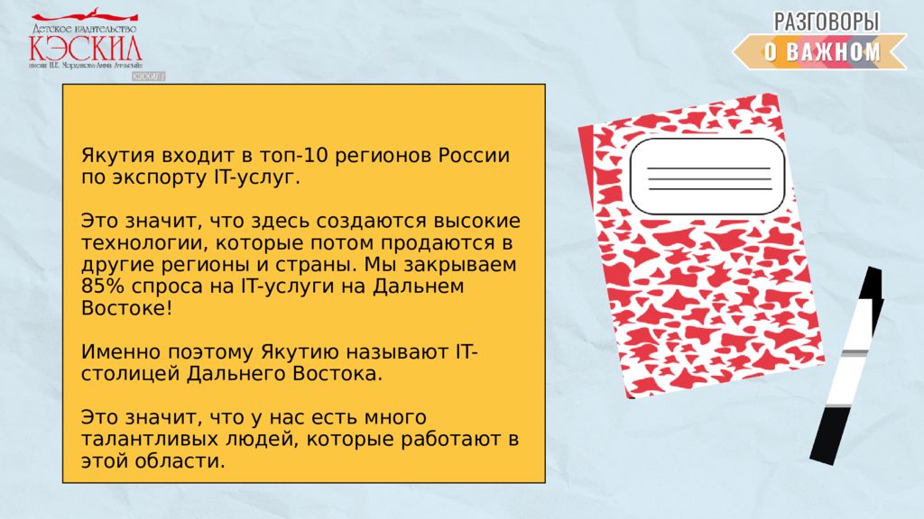 Якутия входит в топ-10 регионов России по экспорту IT-услуг. Это значит, что здесь создаются высокие технологии, которые потом продаются в другие регионы и страны. Мы закрываем 85% спроса на IT-услуги на Дальнем Востоке! Именно поэтому Якутию называют IT-столицей Дальнего Востока. Это значит, что у нас есть много талантливых людей, которые работают в этой области.