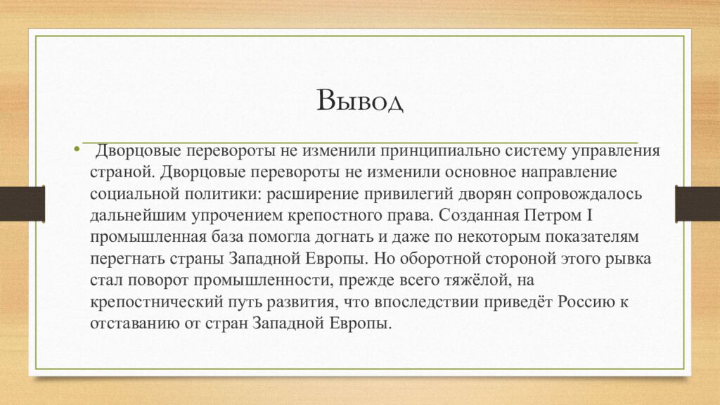 Дворцовые перевороты не изменили принципиально систему управления страной. Дворцовые перевороты не изменили основное направление социальной политики: расширение привилегий дворян сопровождалось дальнейшим упрочением крепостного права. Созданная Петром I промышленная база помогла догнать и даже по некоторым показателям перегнать страны Западной Европы. Но оборотной стороной этого рывка стал поворот промышленности, прежде всего тяжёлой, на крепостнический путь развития, что впоследствии приведёт Россию к отставанию от стран Западной Европы.