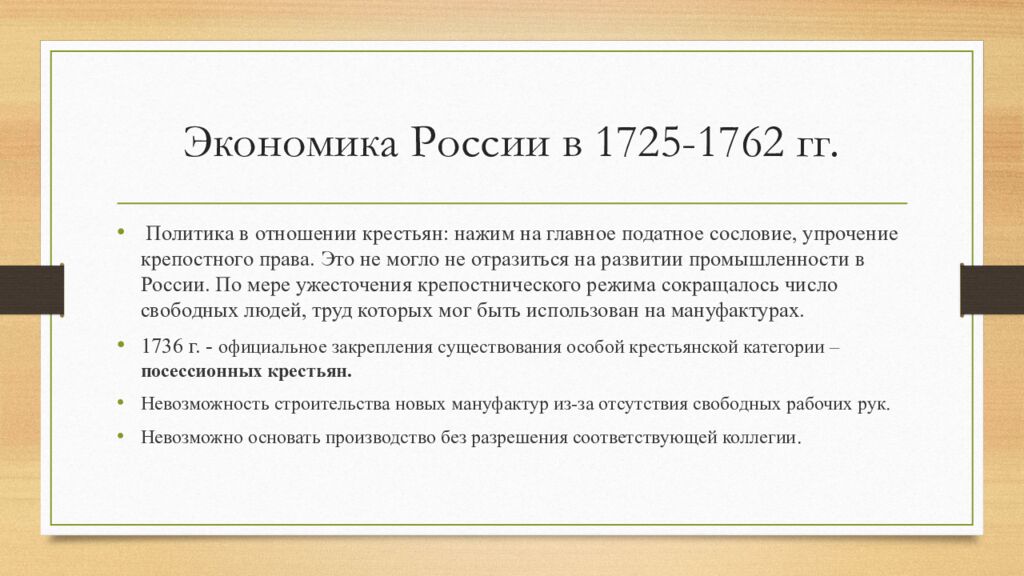Политика в отношении крестьян: нажим на главное податное сословие, упрочение крепостного права. Это не могло не отразиться на развитии промышленности в России. По мере ужесточения крепостнического режима сокращалось число свободных людей, труд которых мог быть использован на мануфактурах. 1736 г. - официальное закрепления существования особой крестьянской категории – посессионных крестьян. Невозможность строительства новых мануфактур из-за отсутствия свободных рабочих рук. Невозможно основать производство без разрешения соответствующей коллегии.