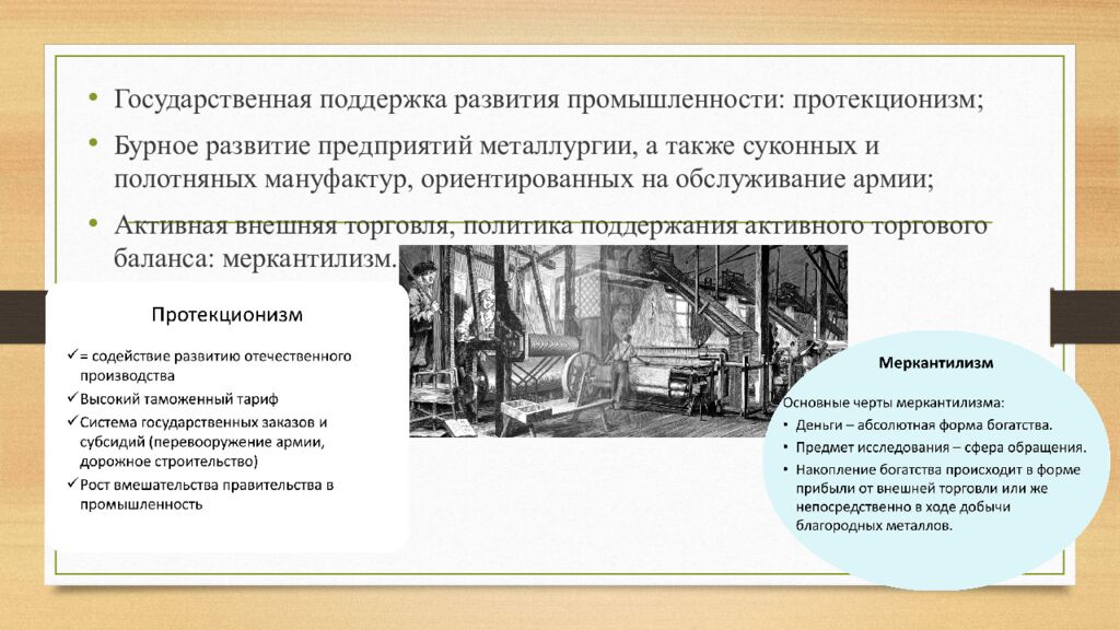 Государственная поддержка развития промышленности: протекционизм ; Бурное развитие предприятий металлургии, а также суконных и полотняных мануфактур, ориентированных на обслуживание армии ; Активная внешняя торговля, политика поддержания активного торгового баланса: меркантилизм.