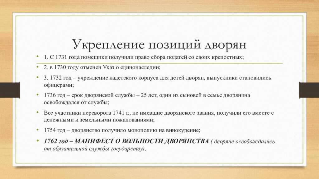 1. С 1731 года помещики получили право сбора податей со своих крепостных; 2. в 1730 году отменен Указ о единонаследии; 3. 1732 год – учреждение кадетского корпуса для детей дворян, выпускники становились офицерами; 1736 год – срок дворянской службы – 25 лет, один из сыновей в семье дворянина освобождался от службы; Все участники переворота 1741 г., не имевшие дворянского звания, получили его вместе с денежными и земельными пожалованиями; 1754 год – дворянство получило монополию на винокурение; 1762 год – МАНИФЕСТ О ВОЛЬНОСТИ ДВОРЯНСТВА ( дворяне освобождались от обязательной службы государству).