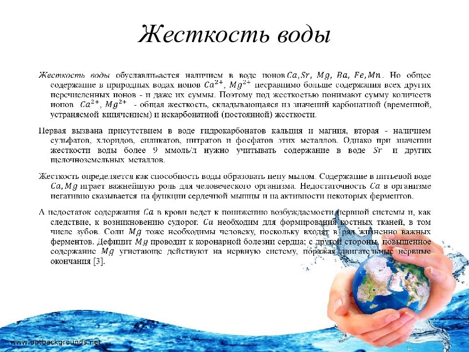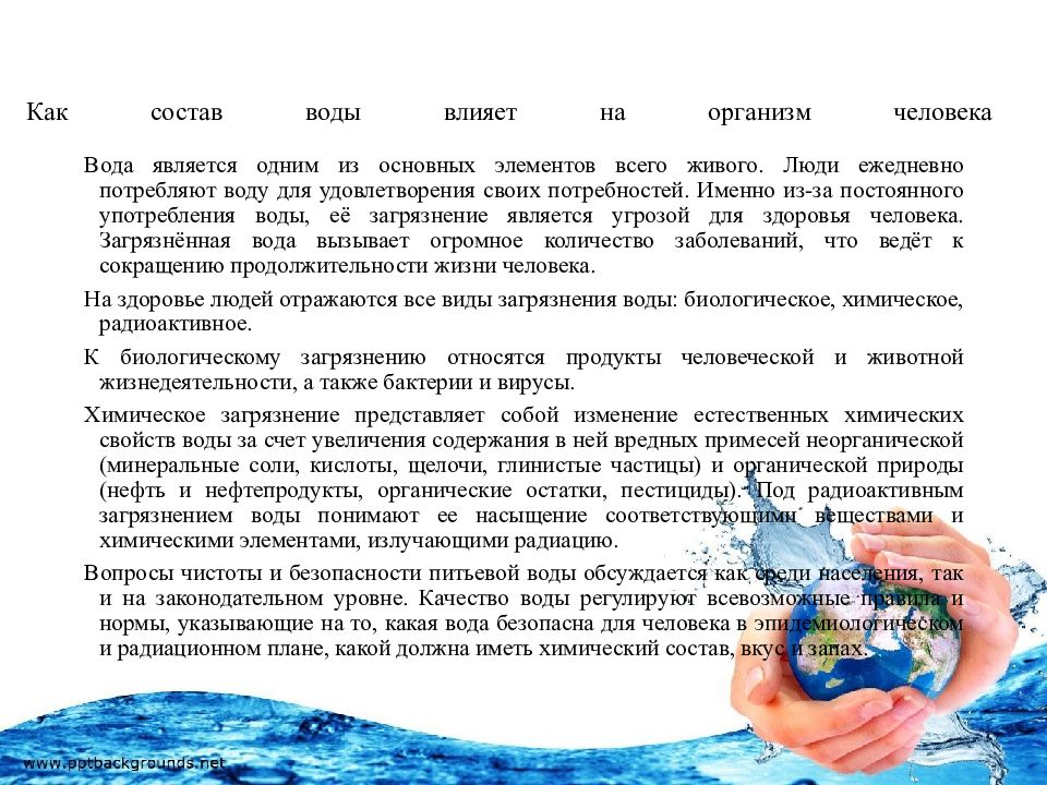 Вода является одним из основных элементов всего живого. Люди ежедневно потребляют воду для удовлетворения своих потребностей. Именно из-за постоянного употребления воды, её загрязнение является угрозой для здоровья человека. Загрязнённая вода вызывает огромное количество заболеваний, что ведёт к сокращению продолжительности жизни человека. На здоровье людей отражаются все виды загрязнения воды: биологическое, химическое, радиоактивное. К биологическому загрязнению относятся продукты человеческой и животной жизнедеятельности, а также бактерии и вирусы. Химическое загрязнение представляет собой изменение естественных химических свойств воды за счет увеличения содержания в ней вредных примесей неорганической (минеральные соли, кислоты, щелочи, глинистые частицы) и органической природы (нефть и нефтепродукты, органические остатки, пестициды). Под радиоактивным загрязнением воды понимают ее насыщение соответствующими веществами и химическими элементами, излучающими радиацию. Вопросы чистоты и безопасности питьевой воды обсуждается как среди населения, так и на законодательном уровне. Качество воды регулируют всевозможные правила и нормы, указывающие на то, какая вода безопасна для человека в эпидемиологическом и радиационном плане, какой должна иметь химический состав, вкус и запах.