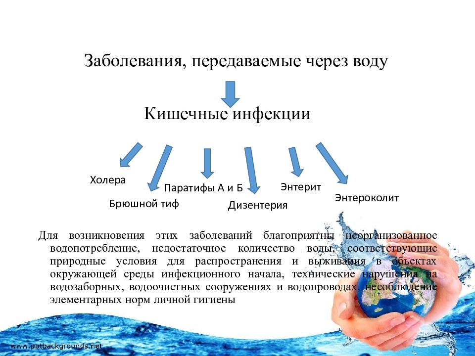Заболевания, передаваемые через воду Кишечные инфекции Для возникновения этих заболеваний благоприятны неорганизованное водопотребление, недостаточное количество воды, соответствующие природные условия для распространения и выживания в объектах окружающей среды инфекционного начала, технические нарушения на водозаборных, водоочистных сооружениях и водопроводах, несоблюдение элементарных норм личной гигиены Холера Брюшной тиф Паратифы А и Б Дизентерия Энтерит Энтероколит