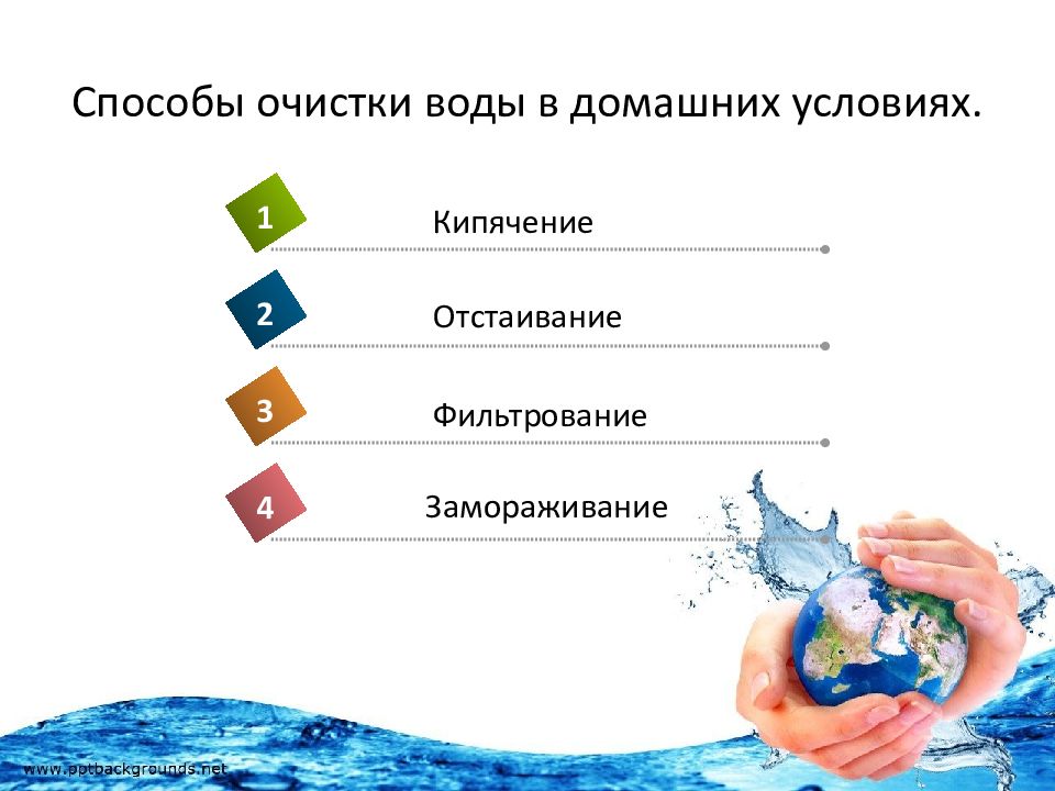 Замораживание 4 Кипячение 1 Отстаивание 2 Фильтрование 3