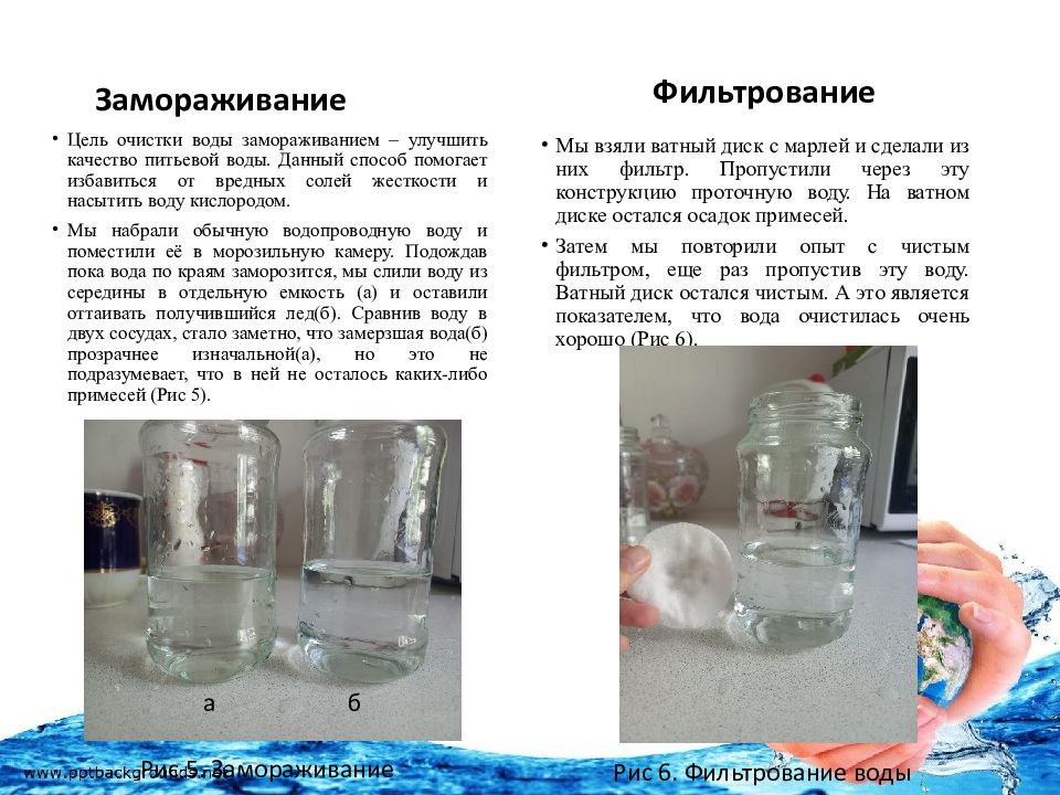 Замораживание Цель очистки воды замораживанием – улучшить качество питьевой воды. Данный способ помогает избавиться от вредных солей жесткости и насытить воду кислородом. Мы набрали обычную водопроводную воду и поместили её в морозильную камеру. Подождав пока вода по краям заморозится, мы слили воду из середины в отдельную емкость (а) и оставили оттаивать получившийся лед(б). Сравнив воду в двух сосудах, стало заметно, что замерзшая вода(б) прозрачнее изначальной(а), но это не подразумевает, что в ней не осталось каких-либо примесей (Рис 5). Фильтрование Мы взяли ватный диск с марлей и сделали из них фильтр. Пропустили через эту конструкцию проточную воду. На ватном диске остался осадок примесей. Затем мы повторили опыт с чистым фильтром, еще раз пропустив эту воду. Ватный диск остался чистым. А это является показателем, что вода очистилась очень хорошо (Рис 6). Рис 5. Замораживание Рис 6. Фильтрование воды а б