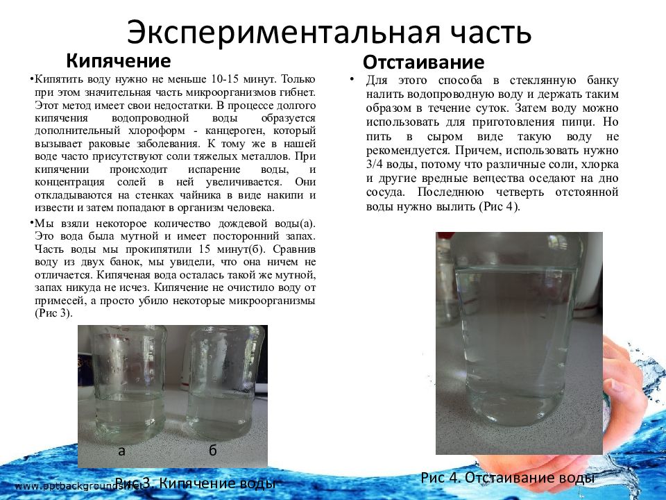 Кипячение Кипятить воду нужно не меньше 10-15 минут. Только при этом значительная часть микроорганизмов гибнет. Этот метод имеет свои недостатки. В процессе долгого кипячения водопроводной воды образуется дополнительный хлороформ - канцероген, который вызывает раковые заболевания. К тому же в нашей воде часто присутствуют соли тяжелых металлов. При кипячении происходит испарение воды, и концентрация солей в ней увеличивается. Они откладываются на стенках чайника в виде накипи и извести и затем попадают в организм человека. Мы взяли некоторое количество дождевой воды(а). Это вода была мутной и имеет посторонний запах. Часть воды мы прокипятили 15 минут(б). Сравнив воду из двух банок, мы увидели, что она ничем не отличается. Кипяченая вода осталась такой же мутной, запах никуда не исчез. Кипячение не очистило воду от примесей, а просто убило некоторые микроорганизмы (Рис 3). Отстаивание Для этого способа в стеклянную банку налить водопроводную воду и держать таким образом в течение суток. Затем воду можно использовать для приготовления пищи. Но пить в сыром виде такую воду не рекомендуется. Причем, использовать нужно 3/4 воды, потому что различные соли, хлорка и другие вредные вещества оседают на дно сосуда. Последнюю четверть отстоянной воды нужно вылить (Рис 4). Рис 3. Кипячение воды Рис 4. Отстаивание воды а б