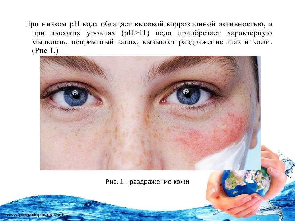 При низком рН вода обладает высокой коррозионной активностью, а при высоких уровнях ( рН >11) вода приобретает характерную мылкость, неприятный запах, вызывает раздражение глаз и кожи.(Рис 1.) Рис. 1 - раздражение кожи