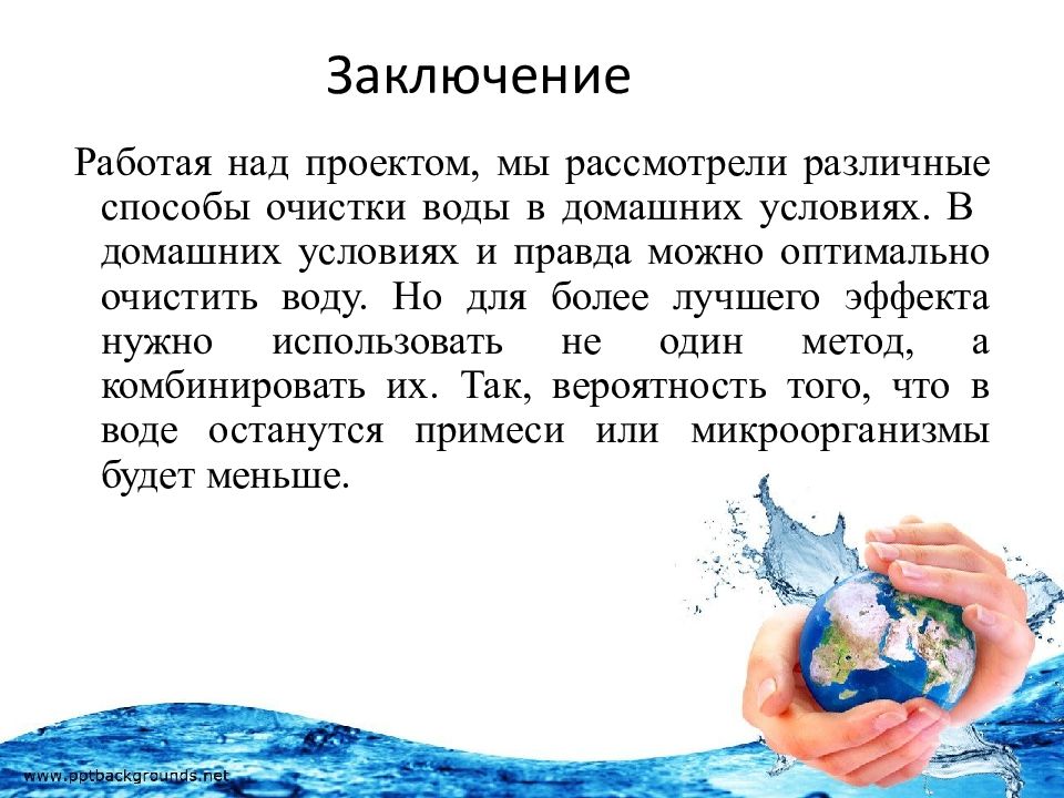 Работая над проектом, мы рассмотрели различные способы очистки воды в домашних условиях. В домашних условиях и правда можно оптимально очистить воду. Но для более лучшего эффекта нужно использовать не один метод, а комбинировать их. Так, вероятность того, что в воде останутся примеси или микроорганизмы будет меньше.