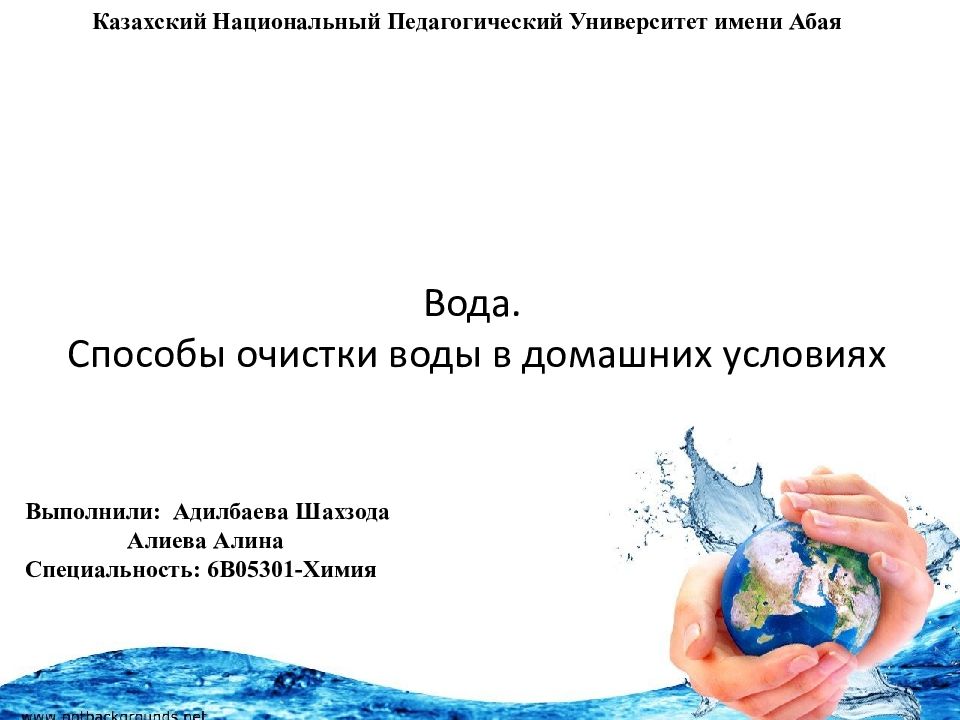 Вода, которую мы пьём Выполнили: Адилбаева Шахзода Алиева Алина Специальность: 6В05301 - Химия Казахский Национальный Педагогический Университет имени Абая Вода. Способы очистки воды в домашних условиях