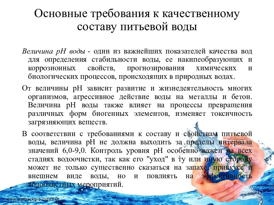 Величина рН воды - один из важнейших показателей качества вод для определения стабильности воды, ее накипеобразующих и коррозионных свойств, прогнозирования химических и биологических процессов, происходящих в природных водах. От величины рН зависит развитие и жизнедеятельность многих организмов, агрессивное действие воды на металлы и бетон. Величина рН воды также влияет на процессы превращения различных форм биогенных элементов, изменяет токсичность загрязняющих веществ. В соответствии с требованиями к составу и свойствам питьевой воды, величина рН не должна выходить за пределы интервала значений 6,0-9,0. Контроль уровня рН особенно важен на всех стадиях водоочистки, так как его "уход" в ту или иную сторону может не только существенно сказаться на запахе, привкусе и внешнем виде воды, но и повлиять на эффективность водоочистных мероприятий.